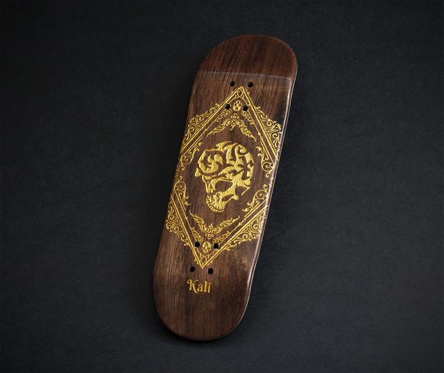 A cybernetic deck crafted for my friend Gabriel, also known as GOBLN. Made using the new Universal mold, it features a stunning golden skull design on a beautiful walnut bottom ply.
