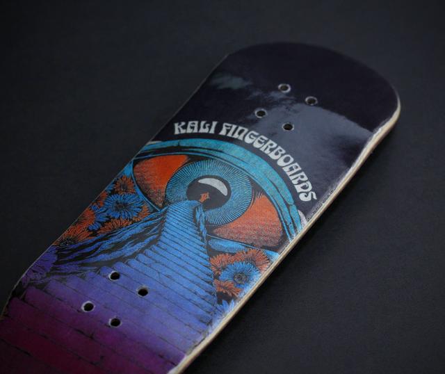 A deck crafted using the new Universal mold, featuring a fiberglass bottom ply covered with an inspiring paper graphic. The deck is composed of 5 maple plies in vibrant colors and an additional fiberglass ply.